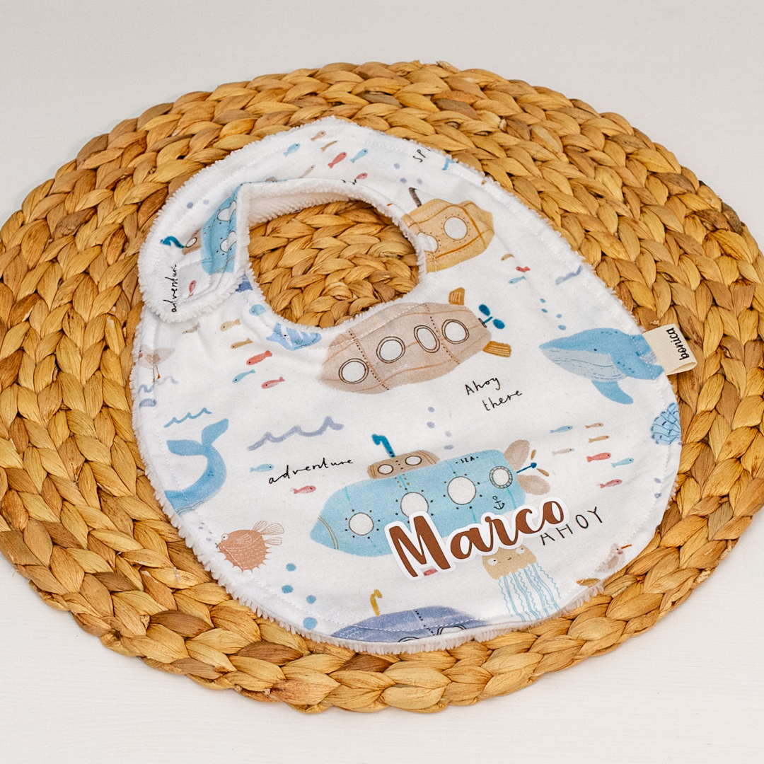 El babero artesanal bebé Submarinos está confeccionado a mano con tela de algodón 100% y un simpático estampado de submarinos y ballenas.