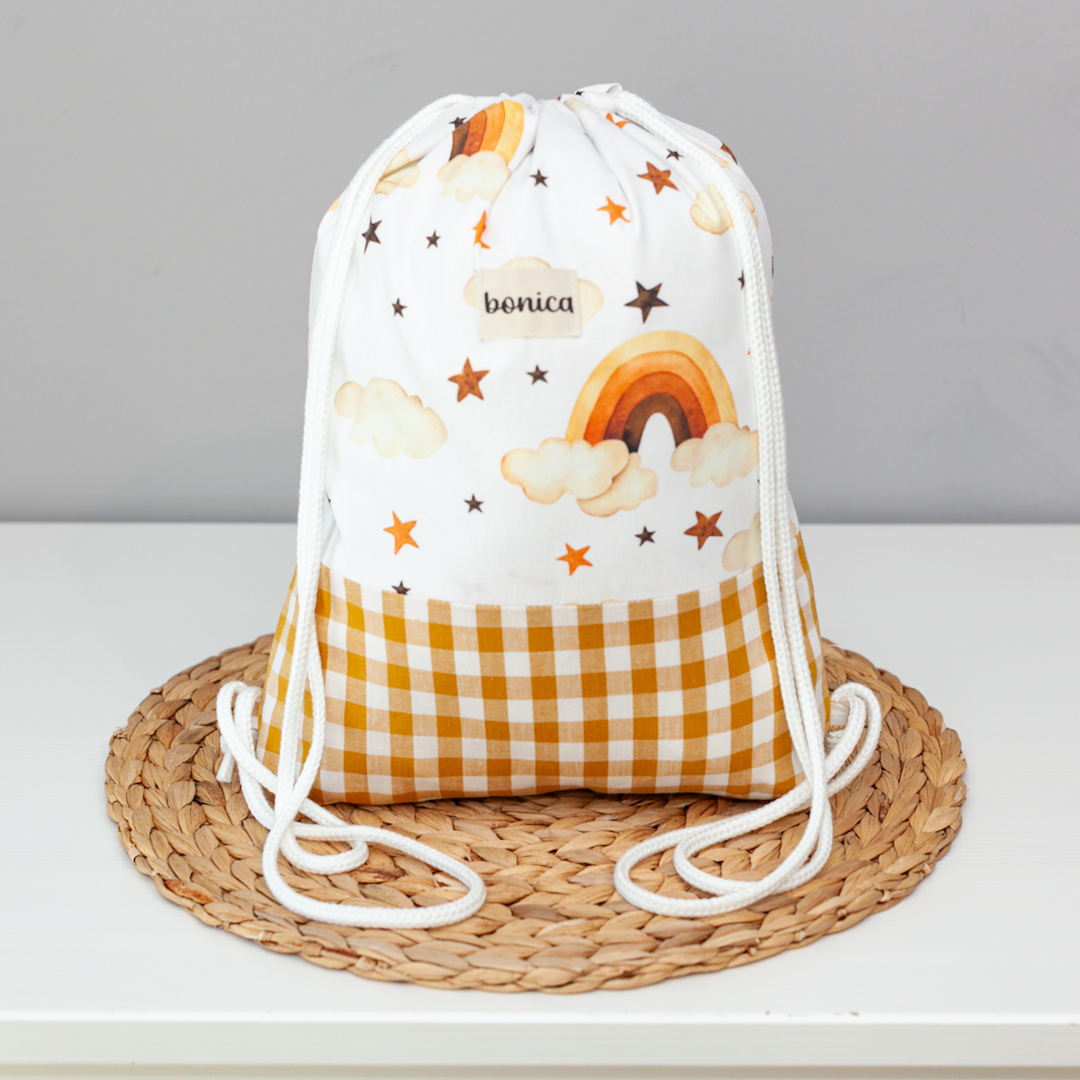 Llena de luz y serenidad el día a día de tu peque con nuestra mochila saco infantil arco iris. Este diseño exclusivo combina un estampado de arcos y estrellas en cálidos tonos ocres sobre fondo blanco, rematado con una base de cuadro vichy ocre que le da un aire artesanal y muy actual. Es la bolsa de tela perfecta para quienes buscan un accesorio unisex, moderno y lleno de magia para la guardería, el colegio o sus primeros paseos.