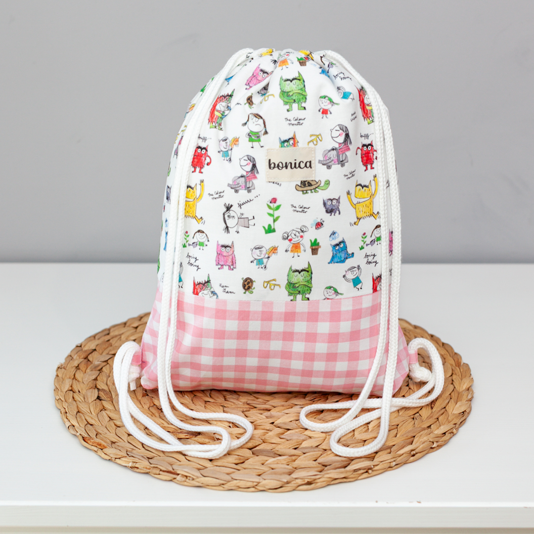 Acompaña a tu peque en el emocionante camino de aprender a identificar sus sentimientos con nuestra mochila saco infantil monstruo de colores rosa. Este diseño exclusivo combina un divertido estampado de los simpáticos monstruos con una base clásica de cuadro vichy rosa, creando un accesorio tierno, alegre y lleno de significado. Es la bolsa de tela ideal para el inicio del curso escolar, la guardería o para llevar sus cuentos favoritos a todas partes.