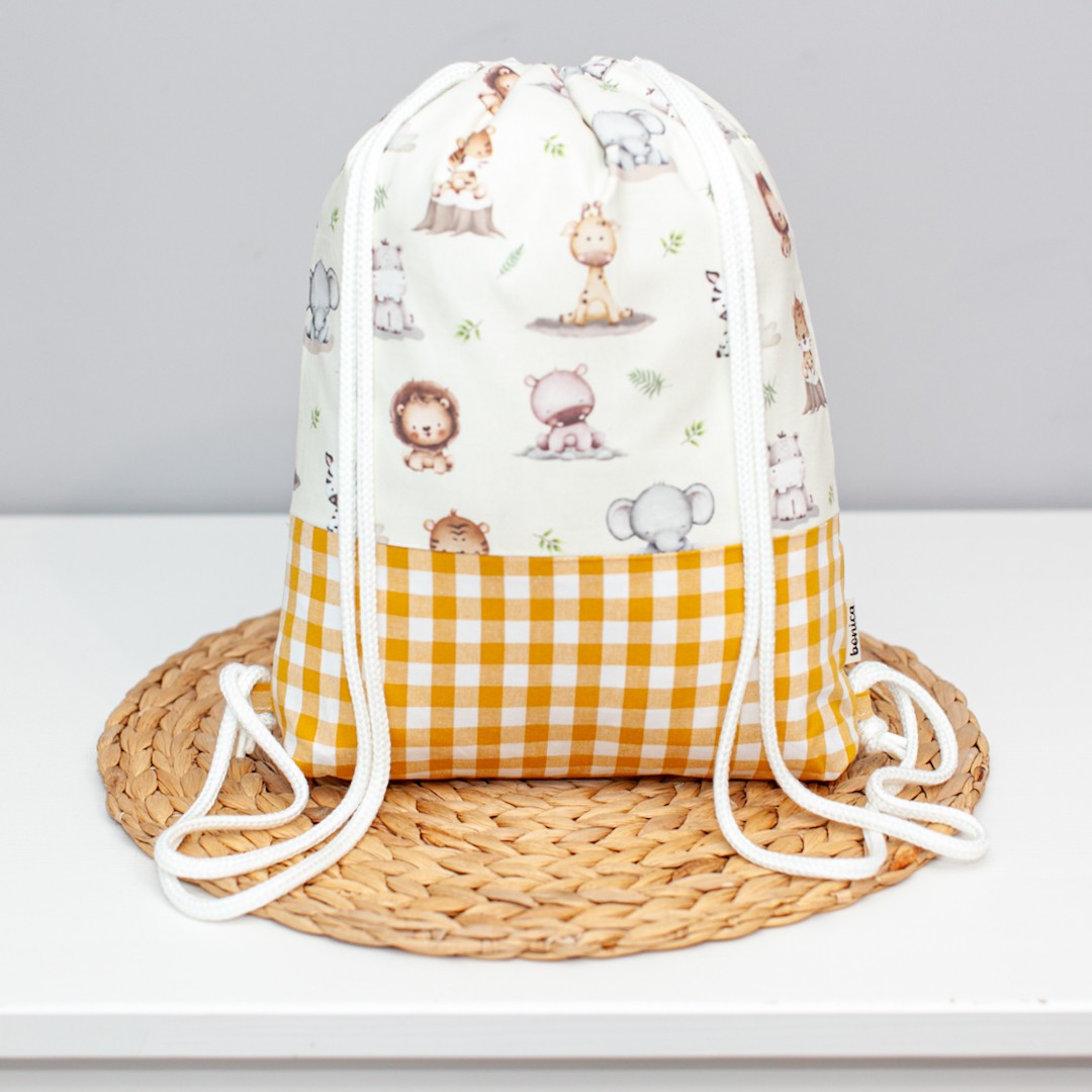 ¡Prepárate para la aventura más salvaje! Nuestra mochila saco infantil safari es el complemento ideal para los pequeños amantes de los animales. Leones, jirafas y elefantes acompañarán a tu peque en su día a día, ya sea para la guardería, el colegio o sus primeras excursiones. Un diseño unisex en tonos tierra y naturales que combina con todo y despierta su imaginación.