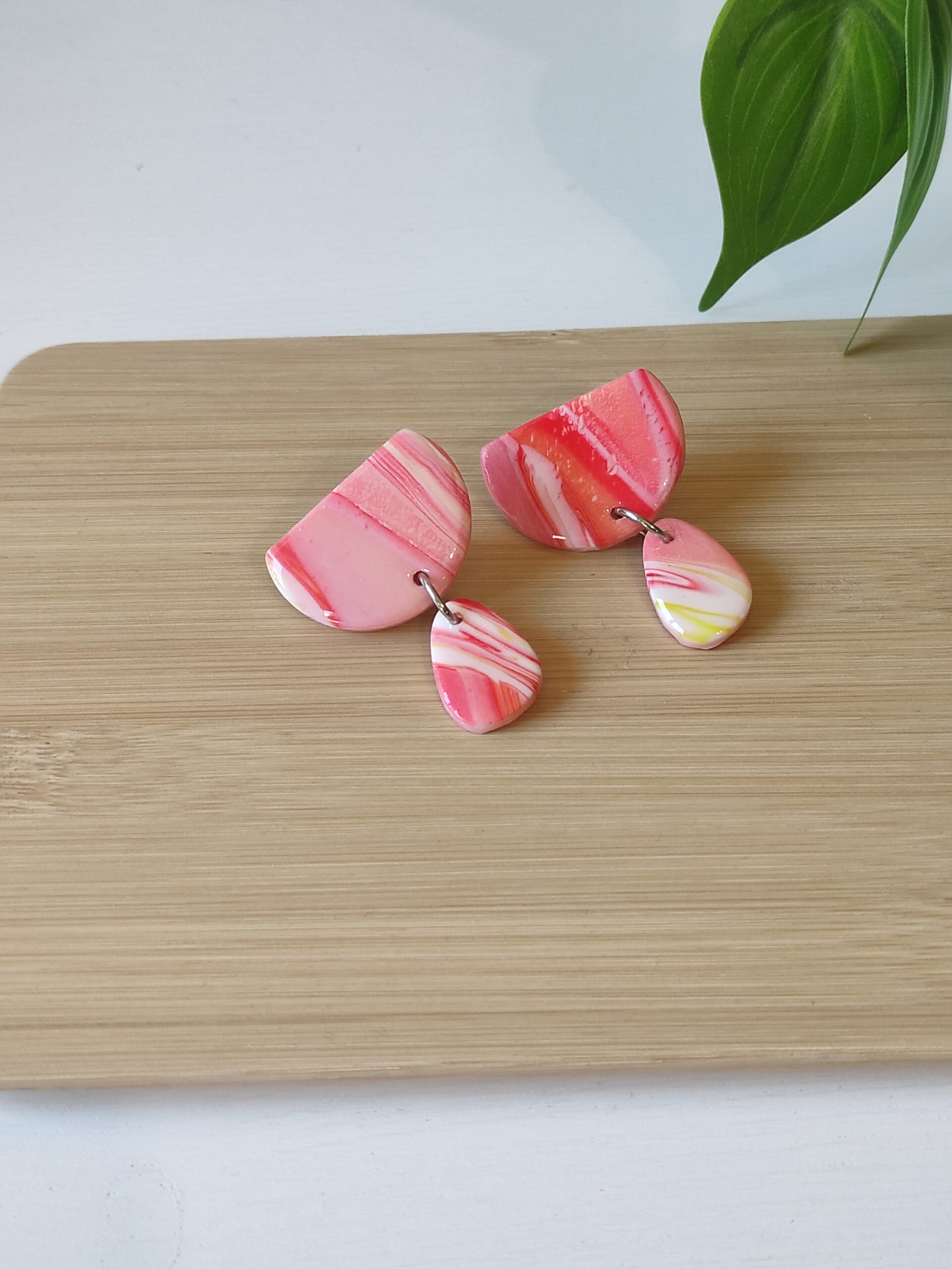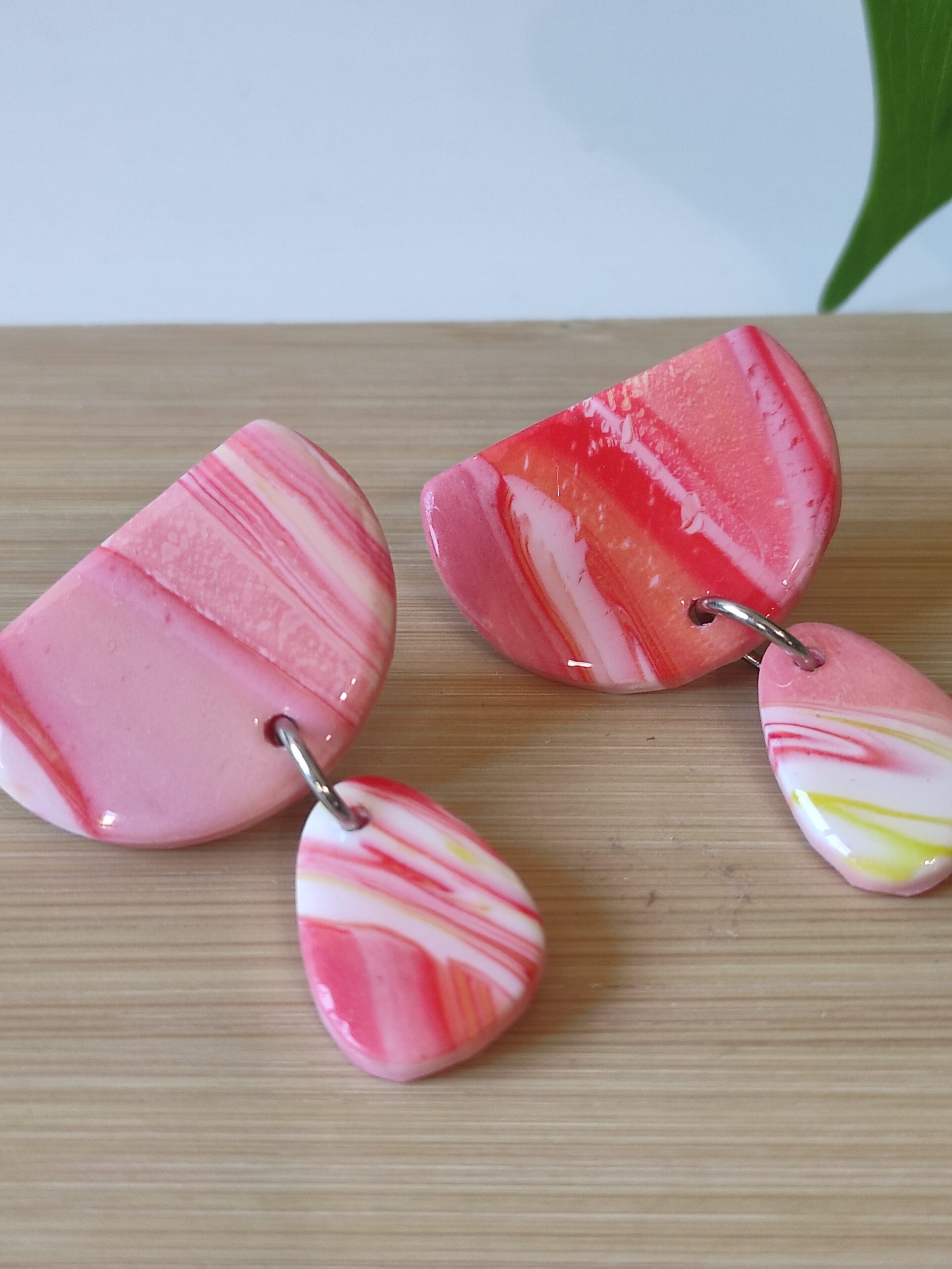 Hechos a mano con arcilla polimérica de efecto marmolado en tonos rojo, coral y blanco, con sutiles toques amarillos, destacan por su diseño moderno, elegante y lleno de vida.