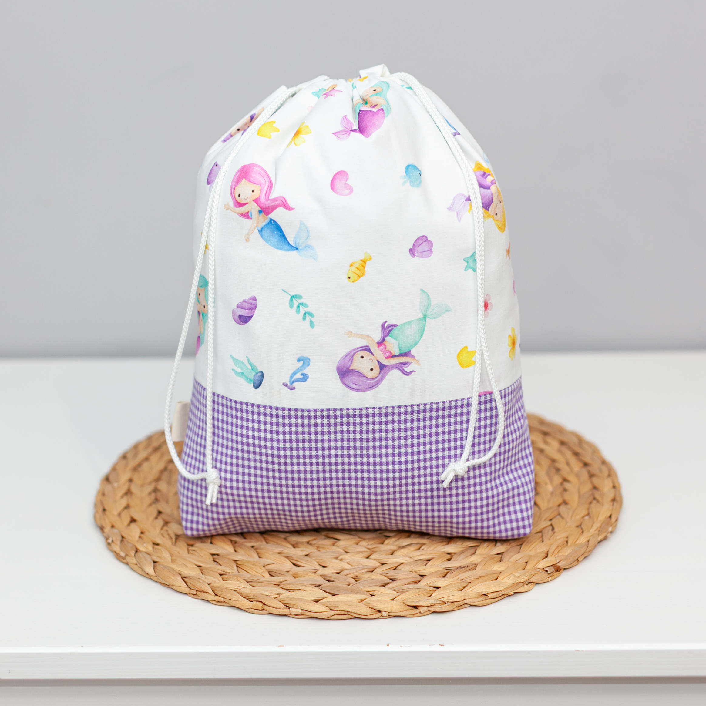 Con su dulce estampado de sirenas, este saquito artesanal aporta un toque de fantasía y ternura a la organización de la muda de tu bebé.