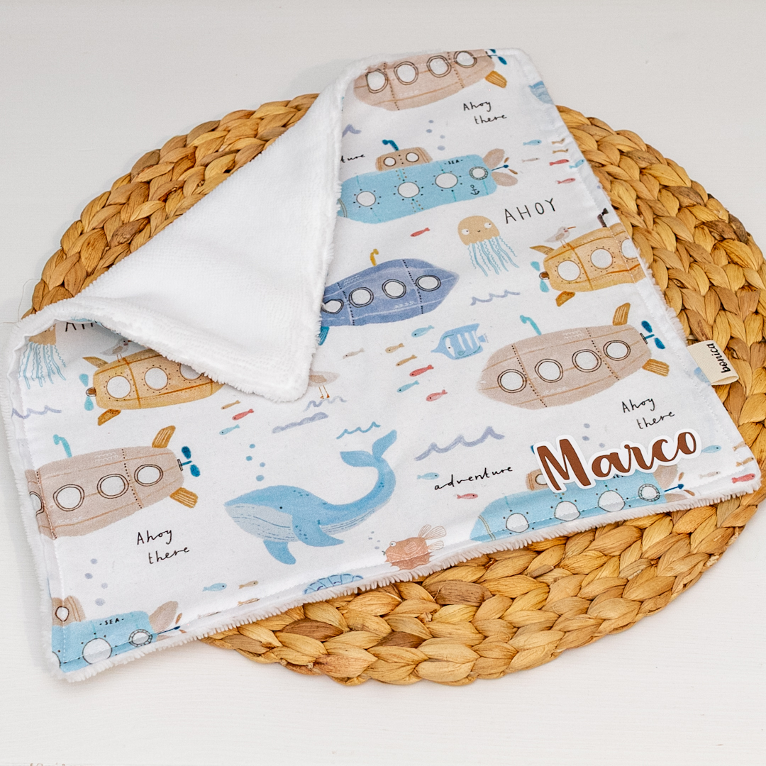 Práctica toalla submarinos para el cole, para el día a día… con una cara de tela estampada 100% algodón y otra cara de toalla ecológica de bambú.